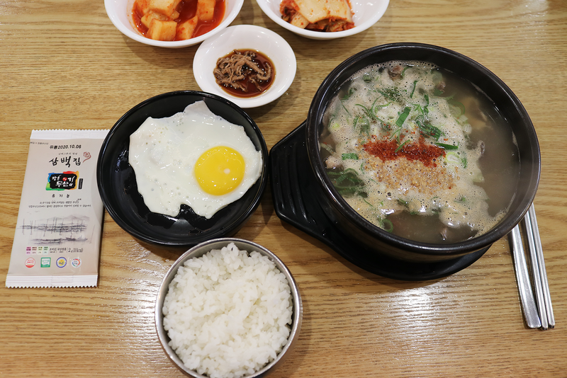 자극적이지 않고 담백한 맛을 자랑하는 삼백집 콩나물국밥은 신선한 재료로 우려낸 육수에 무농약으로 생산된 콩나물과 잘 지어진 밥을 말아 갖은양념과 계란 하나를 넣어 끓여낸 메뉴입니다. 시원한 속풀이용 해장국이자 든든한 한 끼 식사로 60여 년 동안 단골 손님들에게 사랑받아 온 삼백집의 대표 메뉴인 콩나물국밥은 국밥을 다 먹는 내내 김이 가시지 않는다는 점이 정말 놀라웠습니다.