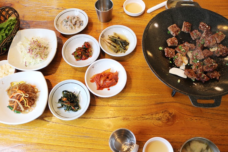 떡갈비세트를 주문하면 맛있는 밑반찬과 함께 들깨가 들어 진한 맛을 자랑하는 된장국, 맛있는 냄새를 풍기는 떡갈비가 나옵니다. 떡갈비는 먹는 내내 식지 않도록 고체 알코올로 데워 주기 때문에 식사를 다 마칠 때까지 따뜻하고 부드러운 떡갈비를 맛볼 수 있습니다.
