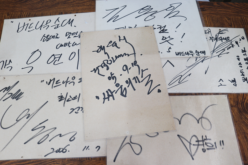 사장님께서는 뭐 꾸며진 것도 없는데 자꾸 사진을 찍는다며 당황하셨지만 ‘영화배우 백윤식이 다녀간 맛집이라고 해서 찾아왔어요’라고 말씀드리니 활짝 웃으시면서 숨겨두셨던 사인을 꺼내 보여주셨습니다. 2005년 <싸움의 기술>이 흥행했을 당시 방문해 남긴 사인을 보시면서는 이렇게 알고 찾아와주니 참 감사하다는 말씀도 덧붙이셨습니다.