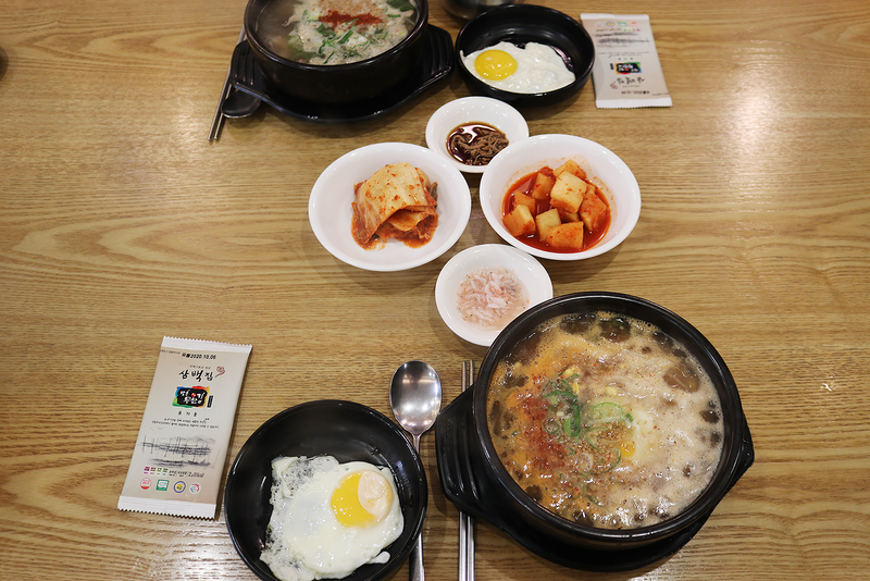 삼백집 콩나물국밥을 주문하면 기본으로 계란후라이, 김을 먼저 주고 밑반찬과 공깃밥, 국밥이 차례로 나옵니다. 밑반찬으로는 배추김치, 깍두기, 새우젓, 장조림이 나오는데 국밥과 잘 어울리는 반찬들로 밑반찬 맛도 매우 좋았습니다.