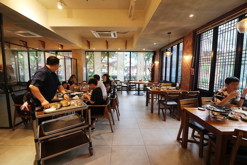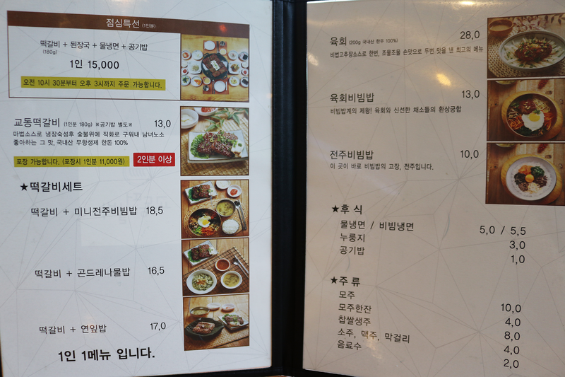 토요일 저녁시간에 방문한 교동떡갈비에는 전주한옥마을을 찾은 관광객들의 발길이 끊이질 않았습니다. 교동떡갈비는 고소한 들깨가 들어가 있는 된장국과 공기밥, 그리고 떡갈비와 찰떡궁합인 물냉면까지 먹을 수 있는 점심특선이 인기가 많고, 떡갈비 세트는 교차 주문이 가능하며 2인분 이상 주문할 수 있습니다. 저희는 미니전주비빔밥 떡갈비 세트, 연잎밥 떡갈비 세트를 주문했습니다.