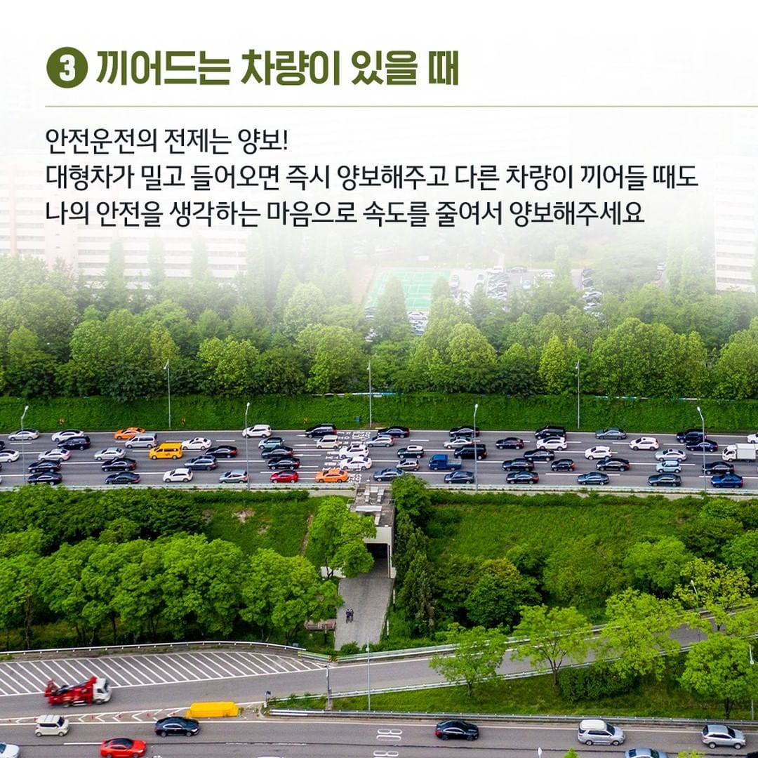 대형차가 밀고 들어오면 즉시 양보해주고 다른 차량이 끼어들때도 너그러운 마음으로 나의 안전을 생각한다는 마음가짐으로 속도를 줄여서 양보해주세요