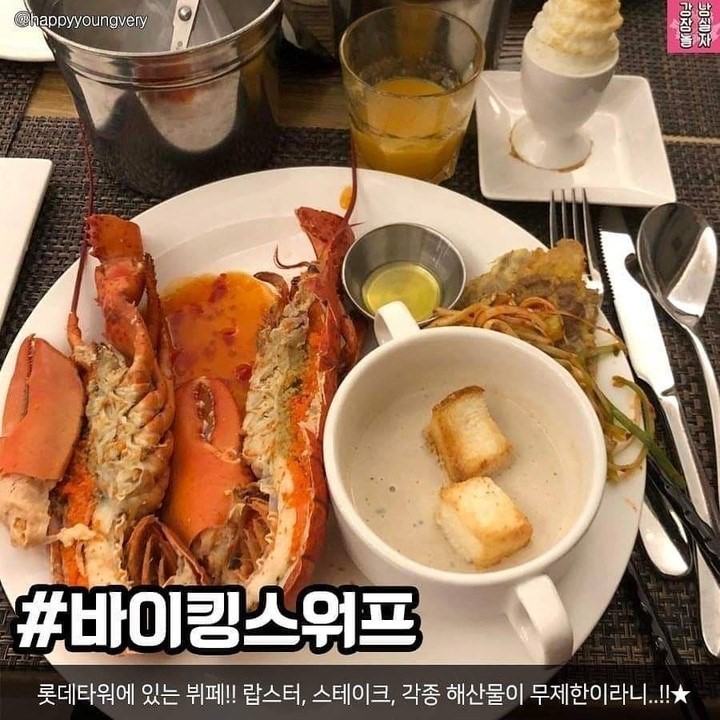 롯데타워에 있는 뷔페로 랍스터, 스테이크, 각종 해산물이 무제한으로 제공된다.
