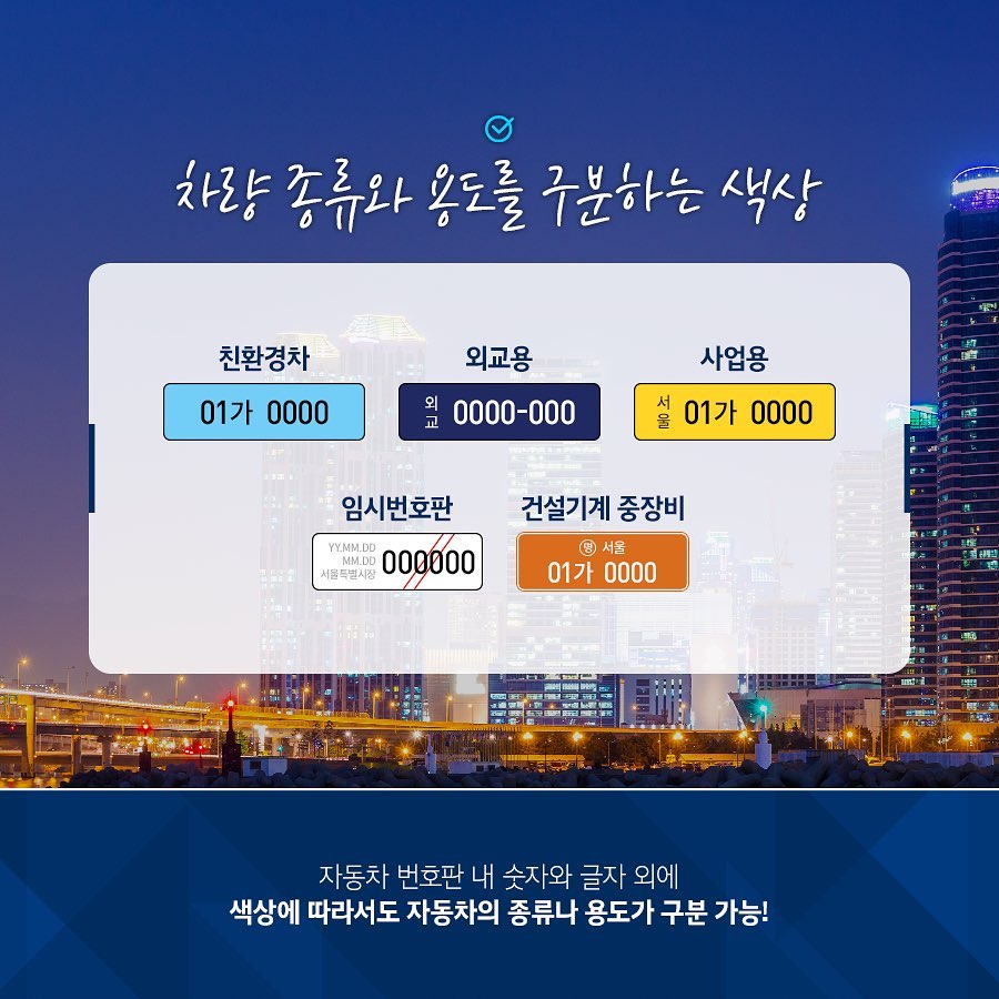 자동차 번호판 내 숫자와 글자외에도 색상에 따라서도 자동차의 종류나 용도를 구분할 수 있습니다.