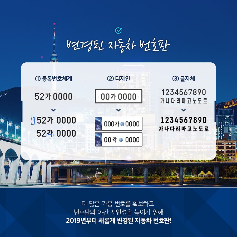 최근에 바뀐 번호판은 더 많은 가용 번호를 확복하고 번호판의 야간 시인성을 높이기 위해 2019년 부터 새롭게 변경된 자동차 번호판이 사용되고 있습니다.