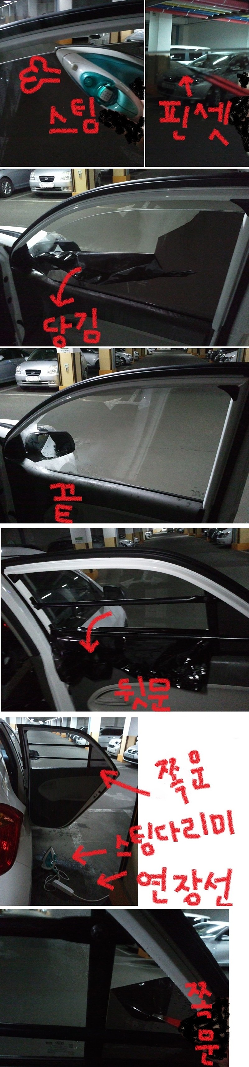 - 앞열 유리창을 살짝 내리고 스팀다리미로 윗부분을 3 - 4회 반복해서 스팀분무해줍니다.