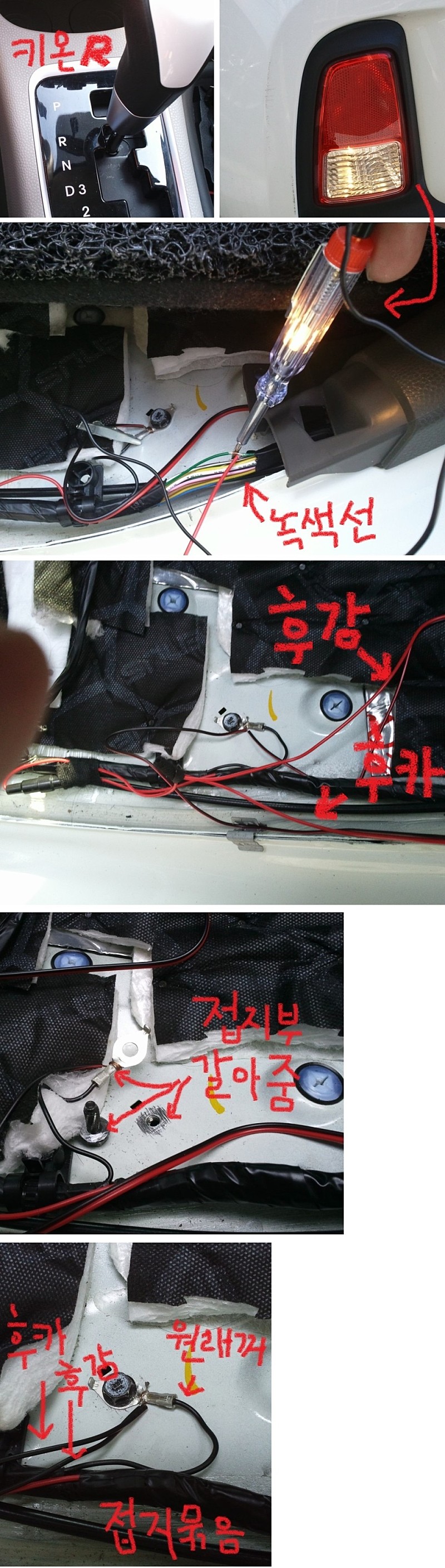 - 리어 스커프 전선묶음중에서 녹색 점등되는 선을 찾아 후방감지기와 후방카메라 빨간선과 연결해줍니다.