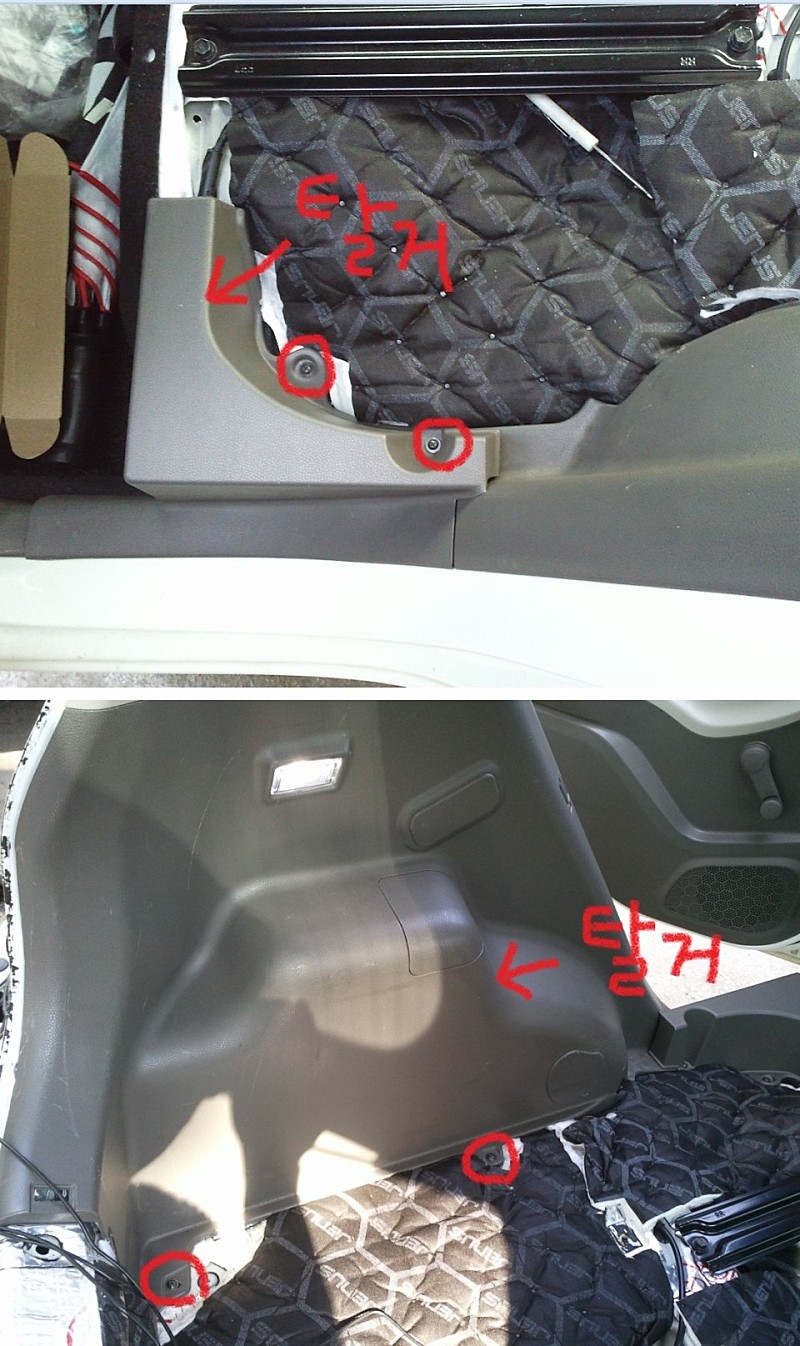 - 실내 뒷공간 플라스틱 트림을 탈거합니다 (리어 스커프 나사 2개, 러기지 나사 2개).