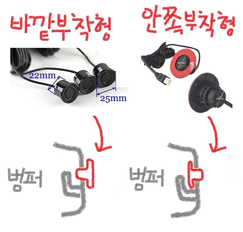 - 안쪽부착형 16.5mm 제품은 센서가 순정처럼 작지만 부착공간 확보를 위해 후면 휠가드 양쪽도 탈거해야 합니다.