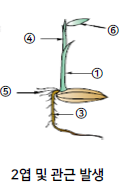 초엽 , 근초 → 본엽 , 씨뿌리 발생 → 모생장