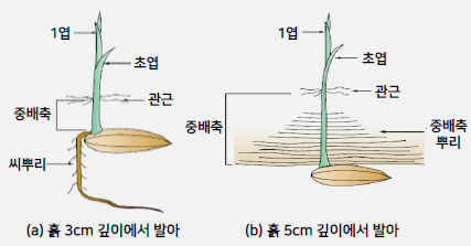 해설 : 벼는 산소를 필요로 하기 때문에, 파종깊이가 깊어지면 발아 후 중배