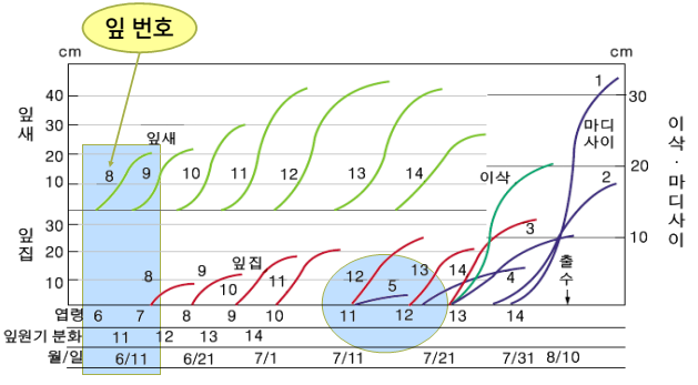3. 벼잎의 출엽주기는 영양생장기에 약 4 ~ 5일, 생식생장기에 약 8일이 걸리고, 출엽주기는 적산온도와 밀접한 관계가 있다. 영양생장기의 출엽주기에 필요한 적산온도는 100℃이고 생식생장기에는 170℃이다.