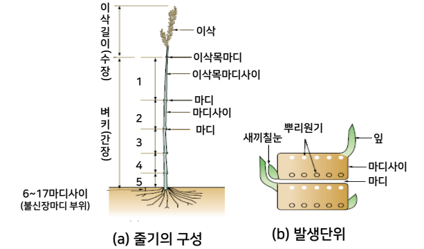 5. 벼줄기는 마디와 마디사이로 이루어져 있고, 각 마디사이의 발생단위로부터 잎, 새끼친줄기, 뿌리가 발생해서 동신생장을 한다. 줄기는 이삭생길때부터 이삭팬 직 후 까지 자라며 이삭의 상위 4 ~ 5개 마디사이가 길게 신장하여 벼의 키를 결정한다.