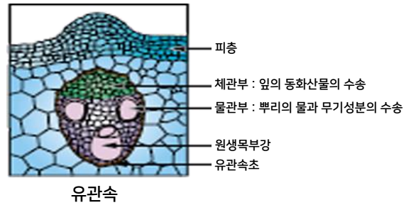 • 물관 : 뿌리에서 흡수한 수분과 무기양분 수송
