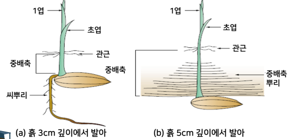 • 발아 볍씨 ⇒ 초엽 혹은 중배축 신장 ⇒ 어린 잎