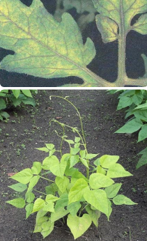 - 황백화현상(黃白化現象, chlorosis) : 잎이 황백색으로 변하는 현상. 엽록소의 구성성분인 N, Mg 등이 결핍되거나 엽록소 생합성에 필요한 Fe과 Mn이 결핍되면 황백화가 일어남