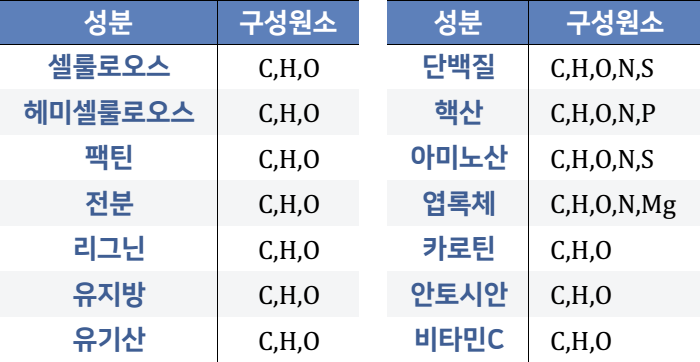 • 유기화합물 95%, C, H, O, N, S, P, Mg