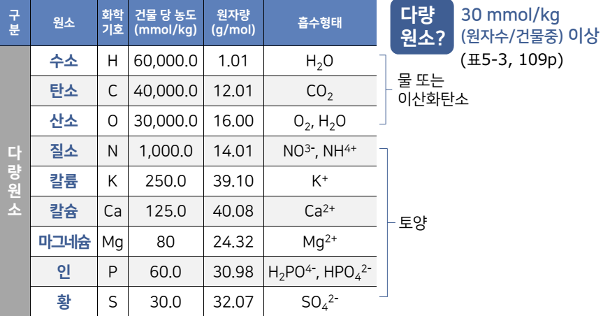 ①, 식물체에서 수분을 제거한 건물의 95% 이상이 유기물이다. 유기물의 종류는 다양하지만 그들의 구성 원소는 단순하다. 기본원소는 C, H, O 등이고, 여기에 N, S, Mg 등이 포함된다. 예로써 엽록소는 N, Mg가 구성 원소이다. (교과서 135쪽)