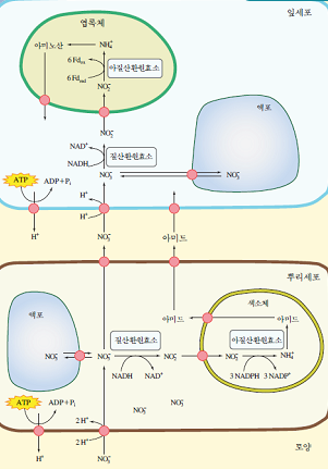 - 제2단계 환원 : 색소체, 아질산환원효소, NO2- → NH3