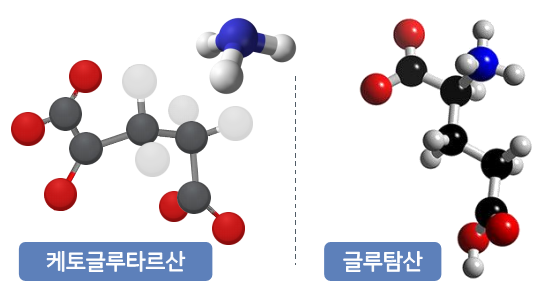 - 글루타민은 α - 케토글루타르산과 반응하면 2분자의 글루탐산을 생성