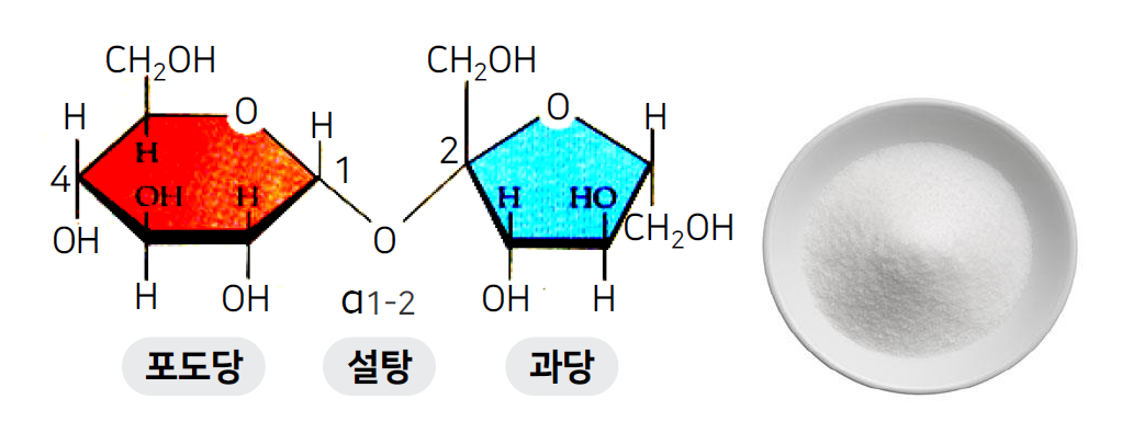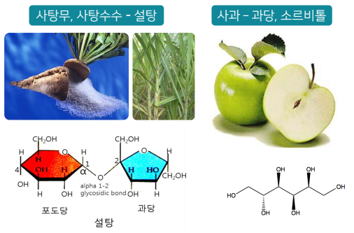 - 설탕 (蔗糖, sucrose) : 포도당과 과당(fructose)이 물 1분자를 잃고 축합된 이당류(二糖類)이며 분자식은 C12H22O11 임