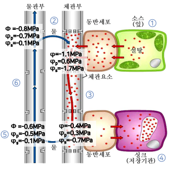 - 체관의 말단부위에서 당이 수용부위(sink)로 빠져나가는 것