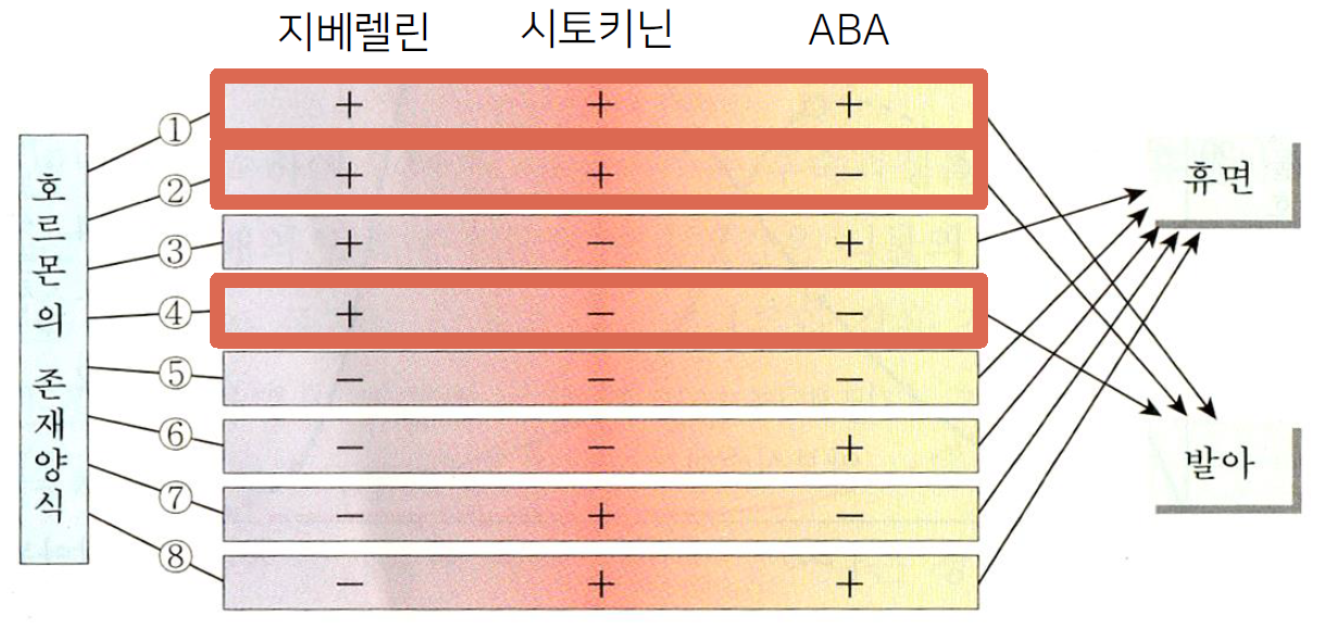 휴면 관련 호르몬 : 아브시스산 (유도) 과 지베렐린 (타파)