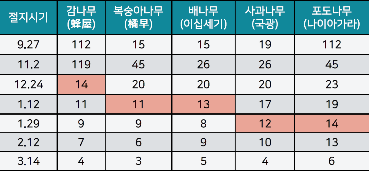 저온 요구도는 수목의 종류나 품종에 따라 다름