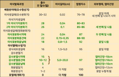 벼 이삭의 발달과정은 출수 전 일수로 예측하고, 엽령지수를 통해 진단할 수 있다.