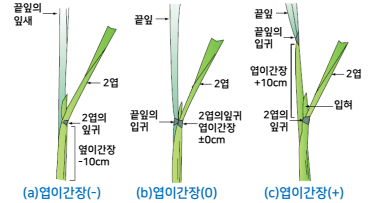 2. 이삭의 발달과정은 출수 전 일수, 엽령지수, 엽이간장 등에 의해서 진단할 수 있다.