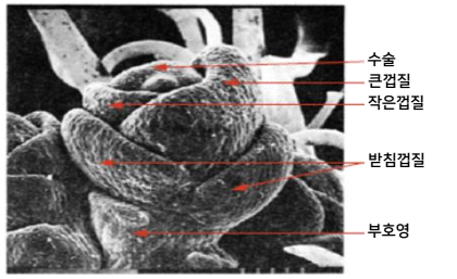 해설 : 인피는 작은 알 모양으로 꽃이 필 때 수분을 흡수하여 커짐으로써 그