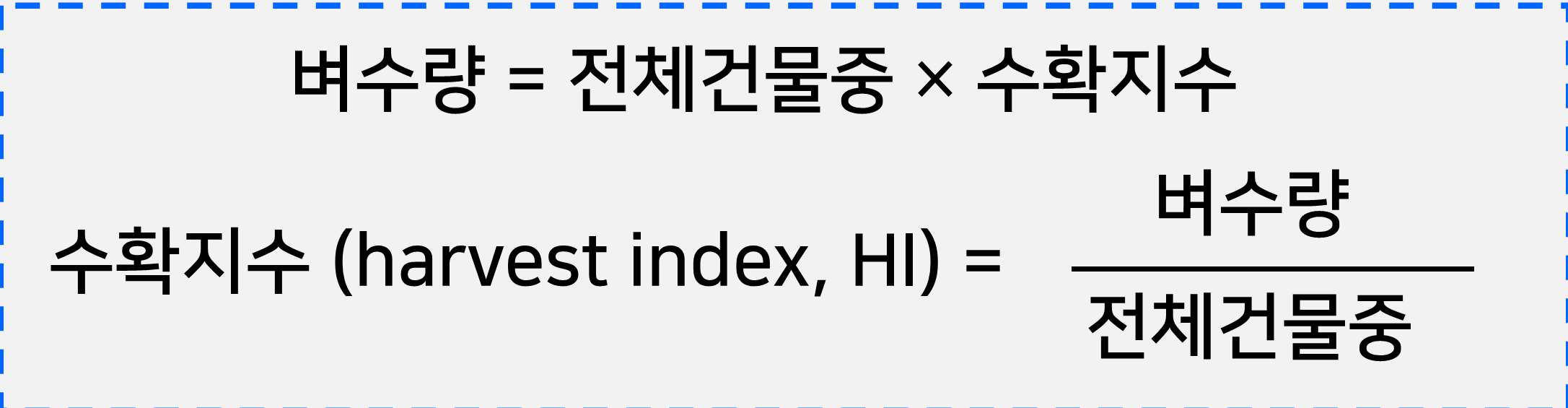 수량은 전체 건물중과 수확지수의 곱으로 이루어지고, 단위면적당 이삭수,