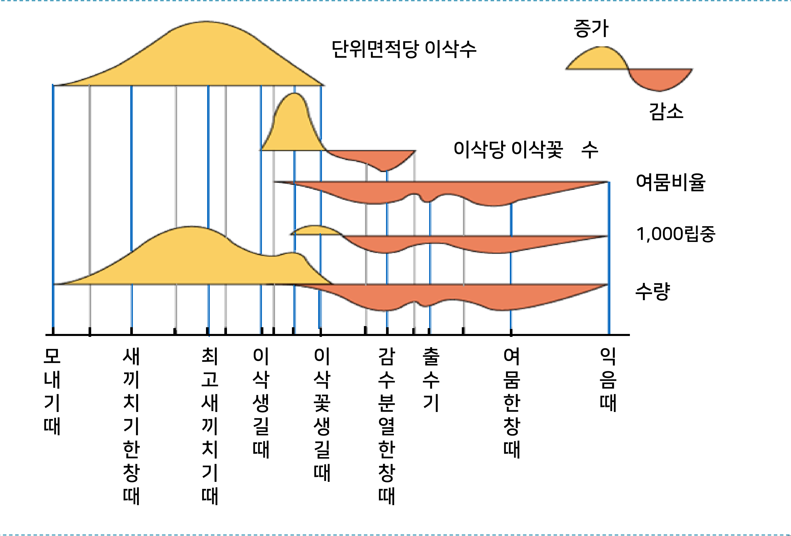 해설 : 벼 개체군의 광합성은 모내기때부터 새끼칠때까지 상승하여 이삭생길