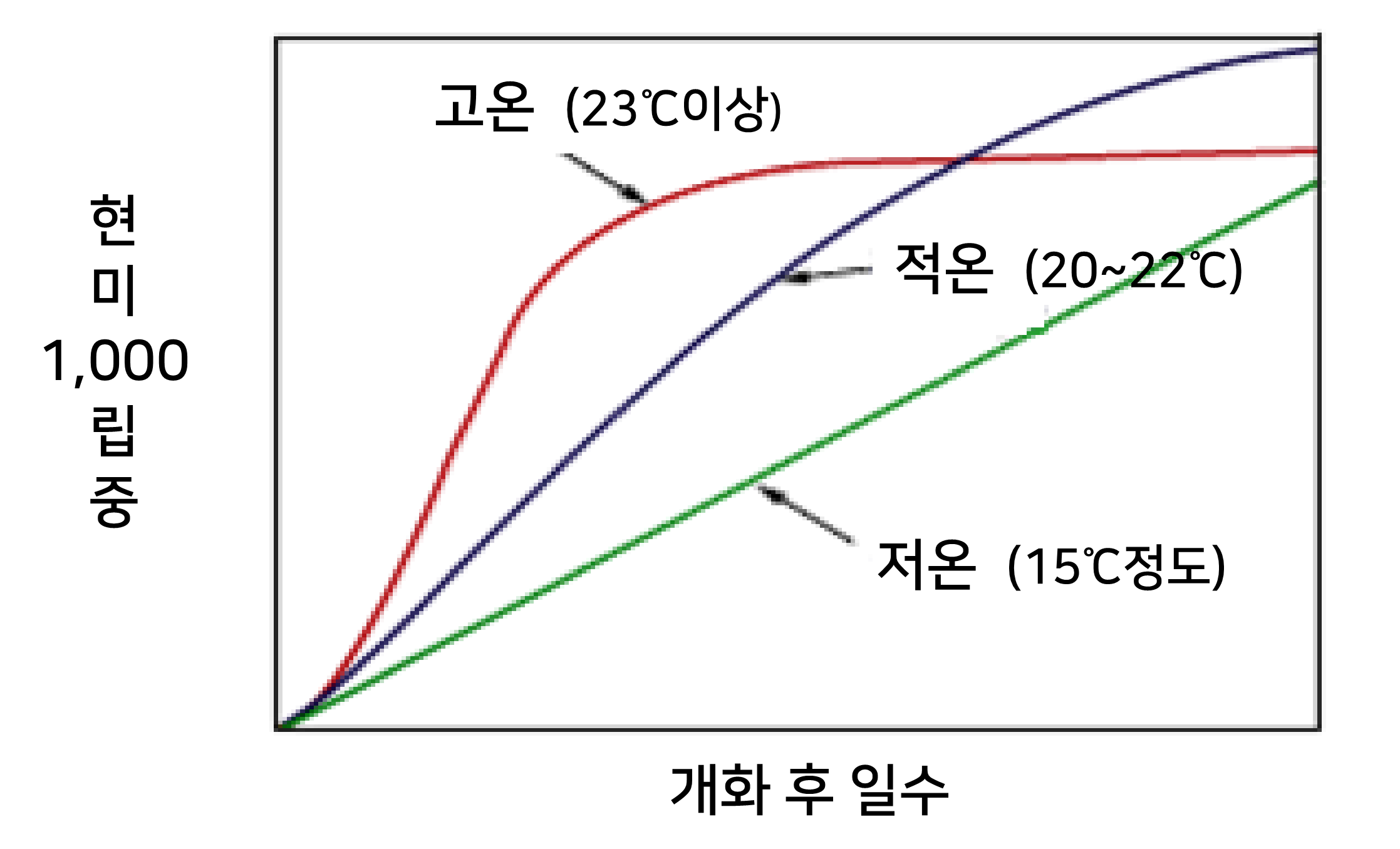 간은 일평균 적산온도와 관련이 있으며, 조생종은 30~35일, 중생종은