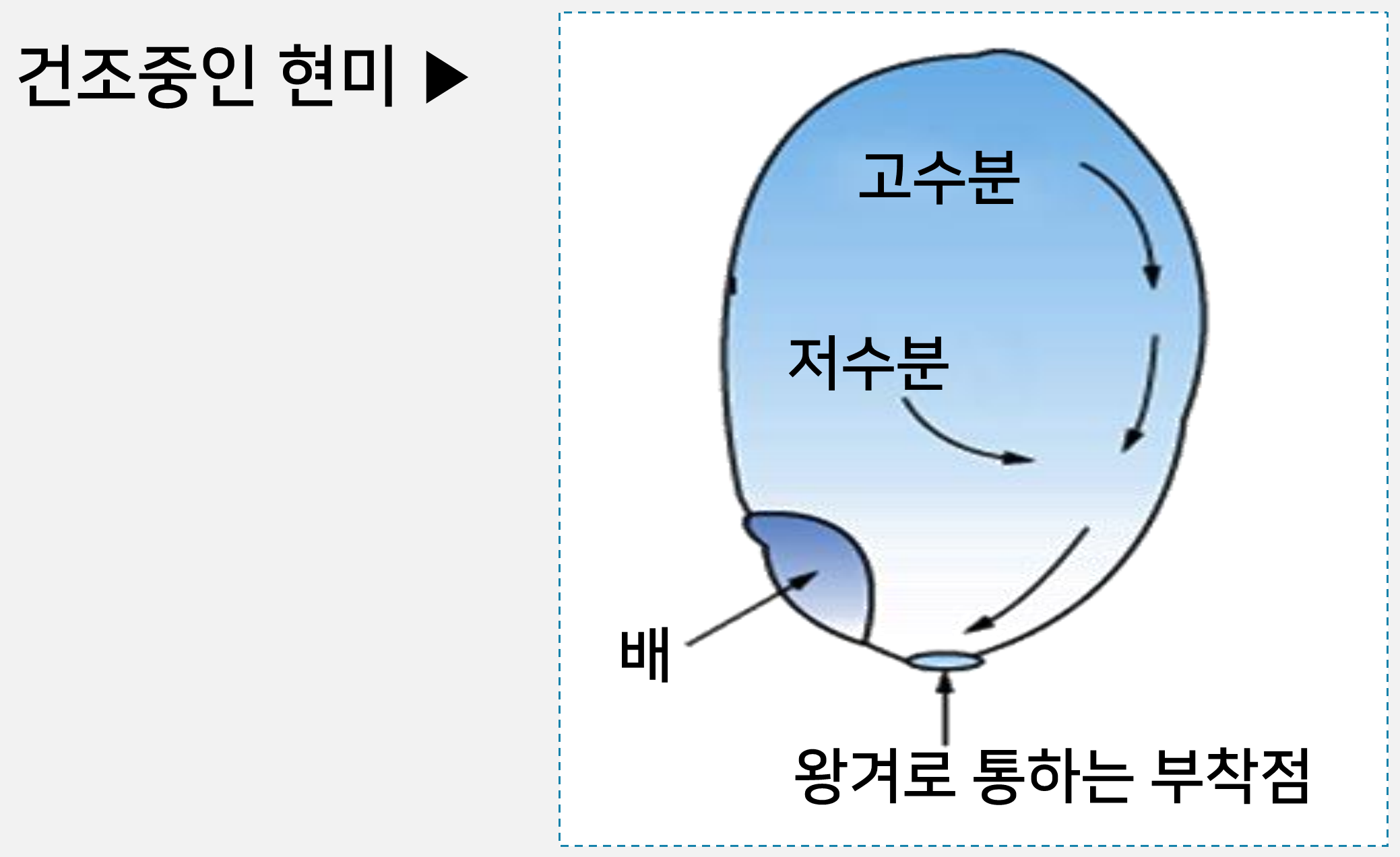 • 수확한 벼를 오래 보관하기 위해 현미의 수분 함량이 15%가 되도록 건조시켜야 한다.