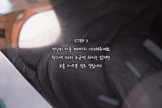 잠시 딴생각을 하는 바람에 시간이 얼마나 지났는지 모르겠다면 '스와이프 테스트'를 해보세요. 왁스를 바른 표면을 손가락 끝으로 가볍게 스윽- 그어보는 간단한 방법의 테스트로 깨끗하게 왁스가 닦인다면 적당히 굳은 것입니다.