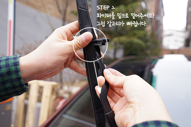 와이퍼를 교체하기 위해서는 우선 기존에 장착되어 있던 와이퍼를 분리해야 합니다. 와이퍼 교체방법은 사실 기존의 와이퍼를 분리하는 작업이 전부라고 해도 과언이 아니에요. 새로운 와이퍼를 장착하는 일은 단지 그 역순일 뿐이니까 말이죠.