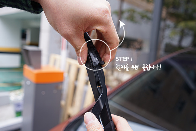 와이퍼 암의 갈고리에 와이퍼를 잘 끼우고, 잠금장치가 딸깍! 하고 끼워질 때까지 위로 밀면 됩니다. 딸깍 소리가 제대로 났다면 힌지를 닫아주세요.