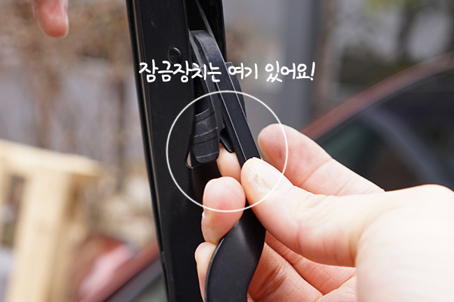 "잠금장치를 누르며 와이퍼를 아래로 밀어주세요."
