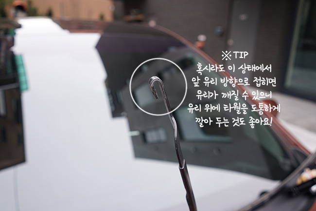 그전에 잠깐! 와이퍼 교체를 하다가 앞 유리가 깨지는 일이 제법 빈번하게 일어나는데요. 그것은 쇠로 된 와이퍼 암이 강하게 접히면서 일어나는 경우가 많습니다. 혹시라도 벌어질 수 있는 불상사를 미연에 방지하기 위해서는 앞 유리에서 와이퍼가 닿는 부위에 수건과 같은 폭신한 완충재를 깔아두는 것이 좋아요!