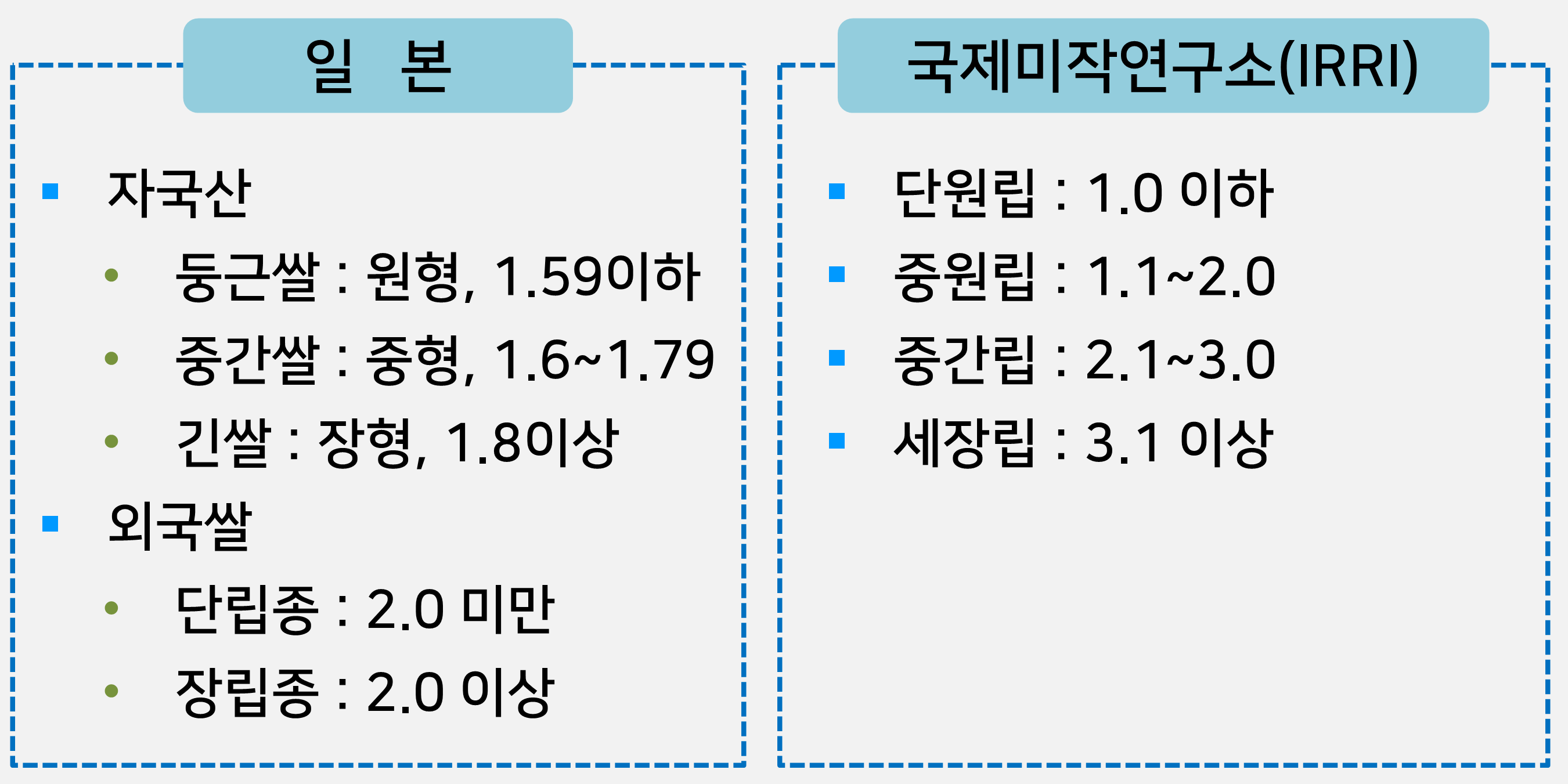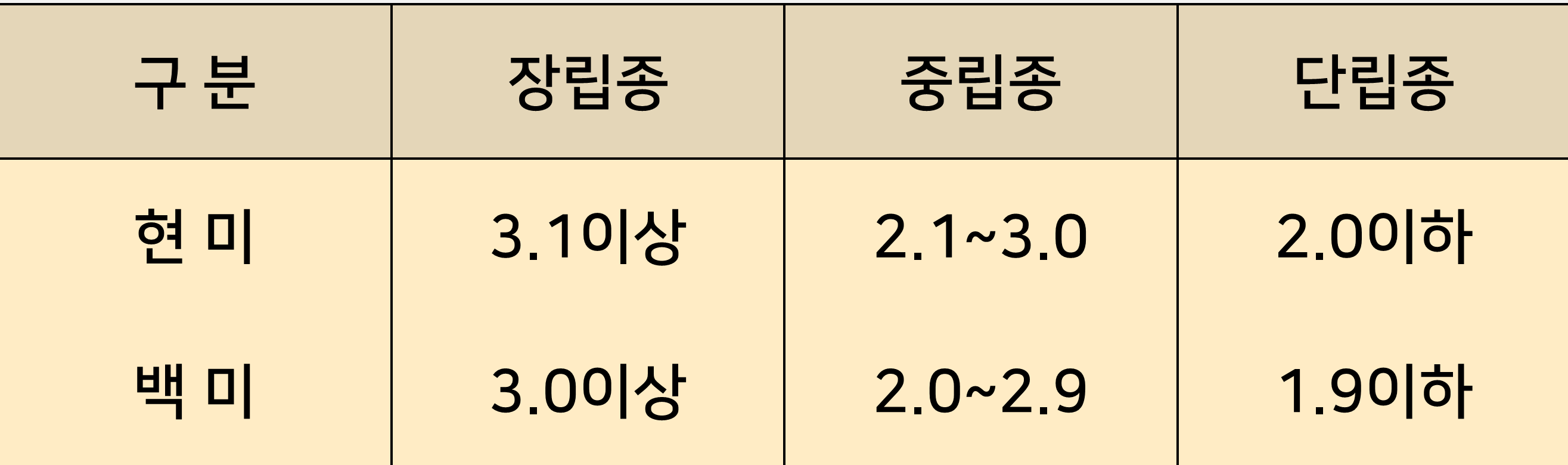 이면 장립종으로 분류한다. 우리나라 사람들은 1.7~2.0사이의 둥근쌀을 좋