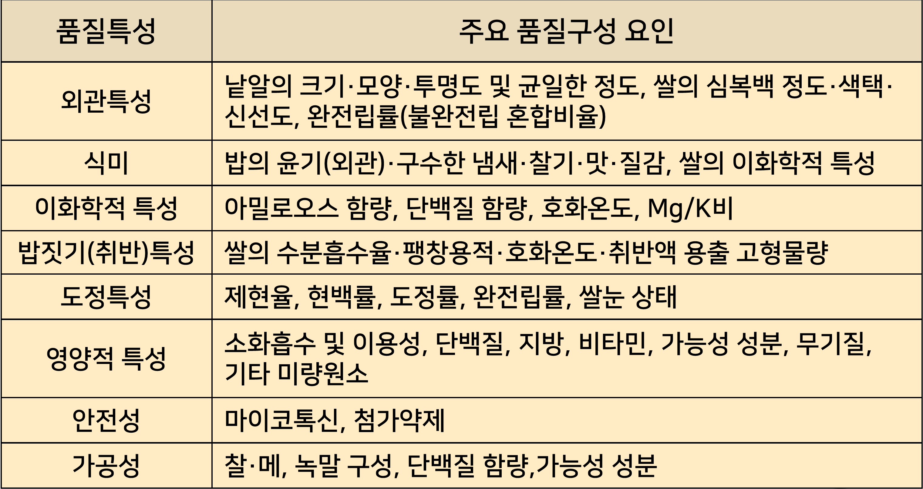 쌀의 화학적 성분 : • 아밀로오스 함량 • 단백질 함량 • 향기성분