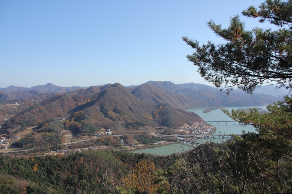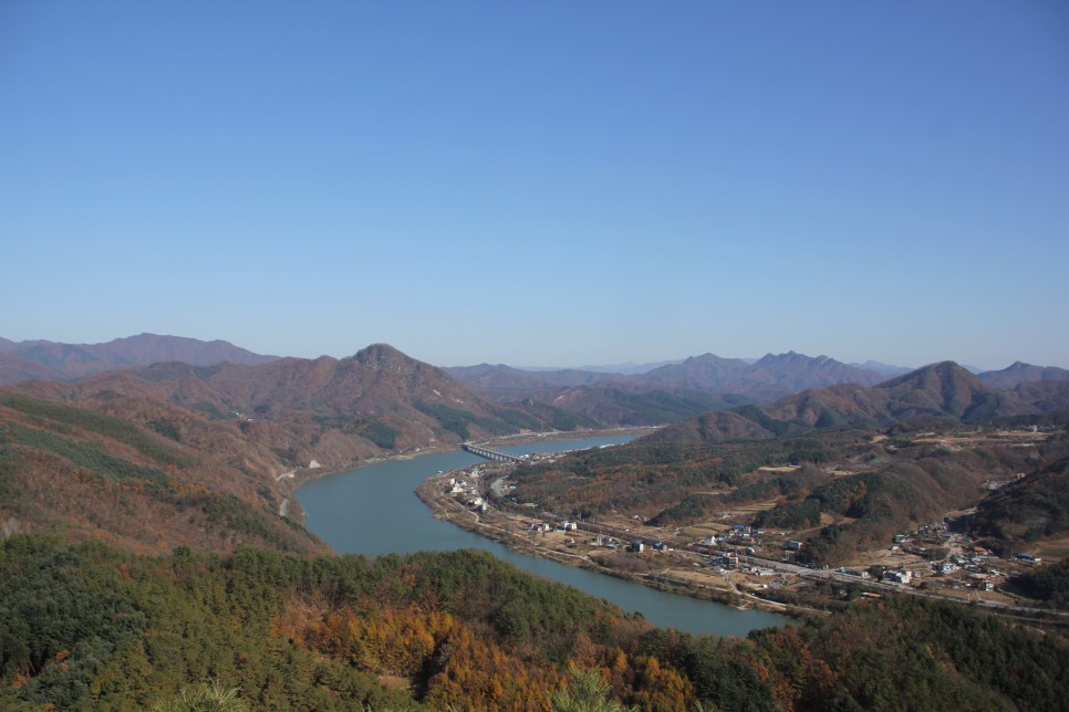 화가가 멋스럽게 강줄기를 휘감아 그려 놓은 듯한 강줄기와 주변의 솟은 산은 ‘절경이란 바로 이런 것이구나.’하는 감탄사를 자아낼 정도이지요. 그리 높지 않은 산을 올라 이런 경치를 담을 수 있다는 것이 호사로 느껴질 정도랍니다.