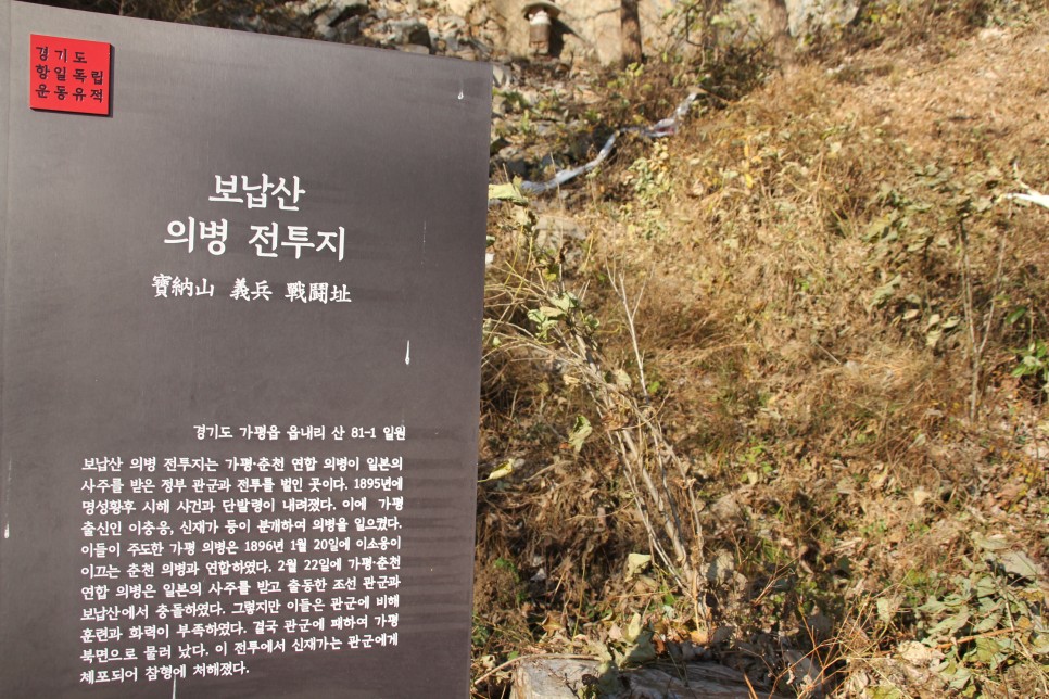 1895년 명성황후 시해 사건과 단발령이 내려졌습니다. 이에 가평 출신인 이충옹 신재가 등이 분노하며 의병을 일으켰는데요. 이들이 주도한 가평 의병은 1896년 1월 이소응이 이끄는 춘천 의병과 연합, 다음 달인 2월 22일 가평, 춘천 연합 의병은 일본의 사주를 받고 출동한 조선 관군과 이곳 보납산에서 전투를 벌였다고 합니다.