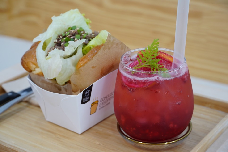 고하우스는 예전에는 수제청을 전문적으로 다루는 곳이였는데요. 수제청과 함께 먹을 수 있는 디저트를 고민하다가 한국식 햄버거 '겹빵'을 만들게 되었다고 합니다. 때문에 고하우스에서는 겹빵 뿐만 아니라 시중에서 만나기 어려운 다양한 수제청도 만나볼 수 있는데요. 레몬, 자몽, 딸기 등등 기본적인 과일청은 물론 서로 궁합이 좋은 과일을 섞어 만든 특별 믹싱 과일청까지 다양한 수제청을 만나볼 수 있습니다. 고하우스에서는 파인애플과 키위를 섞은 '파인키위청', 유자와 라즈베리를 섞은 '유자라브베리청' 그리고 대추, 생각, 도라지, 배, 꿀 등을 섞은 '감기 뚝! 건강청'까지 매우 다양한 수제 과일청을 맛보실 수 있습니다. 참고로 고하우스에서는 겹빵과 함께 수제청을 시키면 1,000원 할인도 해준다고 합니다.