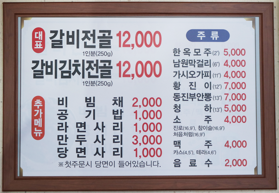 자매갈비전골의 대표 메뉴는 갈비전골(물갈비)가 있고 묵은지 특유의 시원한 맛을 좋아하는 분들을 위해 갈비김치전골도 준비되어 있습니다. 그리고 전주에 오면 꼭 맛봐야 하는 한옥모주와 전라북도 여행객들이 여행 후 인터넷으로 다시 주문해 먹는 막걸리로 유명한 남원막걸리도 판매하고 있으니 숙소가 가까우신 분들은 전주의 전통주 맛도 느껴 보시길 바랍니다.