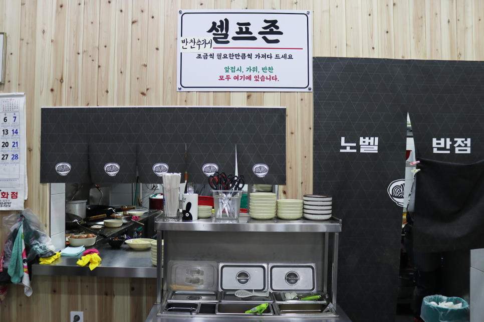 주방 쪽에는 반찬 셀프코너가 있어서 앞접시, 가위, 반찬 등 조금씩 필요한 만큼 가져다 먹을 수 있습니다. 매장이 그리 넓지 않기 때문에 서빙 인원을 최소화해 혼잡도를 줄이기 위한 사장님의 센스가 돋보였습니다.