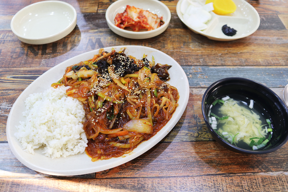 이어 물짜장 다음으로 많이 주문한다는 매콤 잡채밥을 주문해봤습니다. 차림표에는 따로 매콤잡채밥으로 적혀있지 않고 ‘잡채밥’으로 적혀있으니 매운 걸 못 드시는 분들은 잡채밥 주문할 때 참고해서 주문하시기 바랍니다. 잡채밥은 등장과 동시에 어마어마한 불향이 느껴졌는데요. 매운맛을 중화시켜줄 계란탕도 함께 나옵니다.