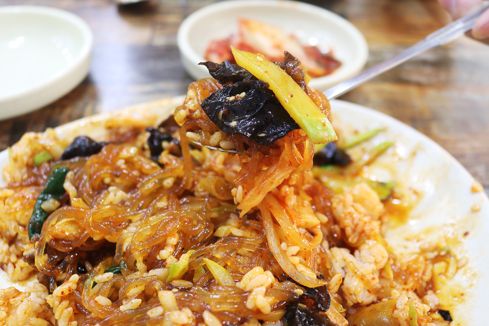 갈비전골을 맛있게 먹은 후 국물이 냄비 나사 부분까지 줄어들었을 때 비빔채를 주문해 비벼 먹으면 됩니다. 비빔채는 <볶음밥>을 차림표에 표기해 놓은 것으로 바쁘지 않을 땐 직원분이 볶아주시지만 이곳이 익숙한 단골손님들은 가게 상황을 봐서 많이 바쁠 땐 남은 밑반찬들도 골고루 넣어서 직접 볶아 먹기도 한다고 합니다.