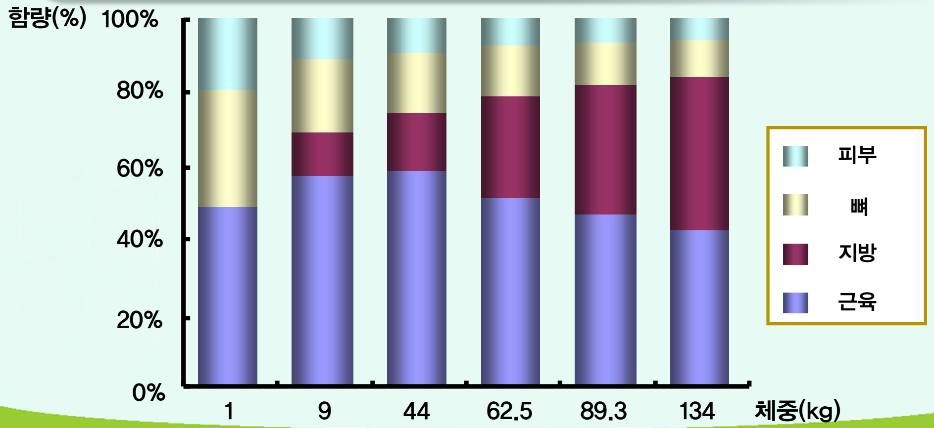 해설 : 돼지는 체중이 증가할수록 체지방의 함량이 증가한다.